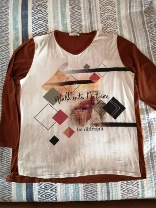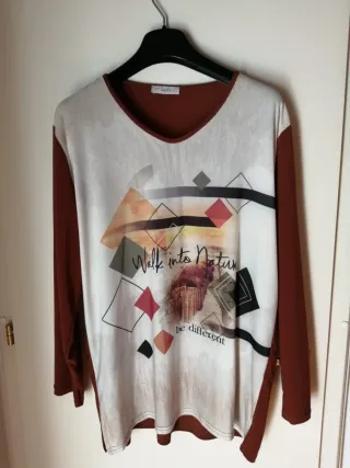 Maglia a maniche lunghe con stampa astratta e scritta Walk into Nature, be different. - Stampa multicolore con forme geometriche. - Maniche lunghe in tinta unita marrone.
