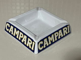 Posacenere Campari in ceramica bianca con logo. - Design a forma di rombo. - Logo Campari blu e giallo.