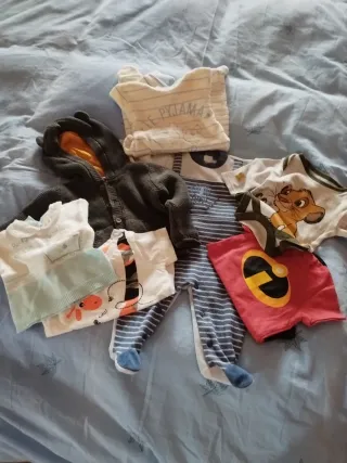Set di abbigliamento per neonato composto da diversi capi. - Due tutina a righe blu e bianche con piedini. - Body a manica corta con stampa Il Re Leone. - maglietta a manica corta con stampa di giraffa e scritta ciao! - Maglioncino con cappuccio e orecchie. Body rosso con stampa Maglioncino cotone con bottoni dietro