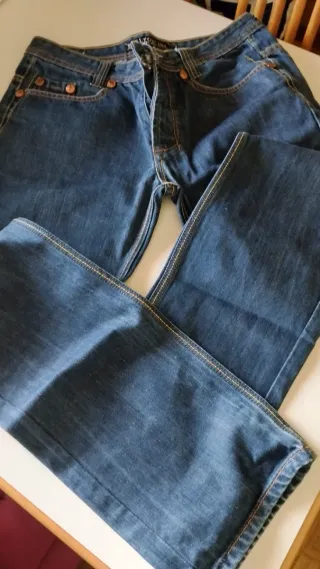 Jeans uomo classici in denim blu. - Modello con cuciture a contrasto. - Dettagli con rivetti in metallo.