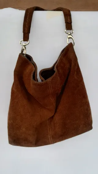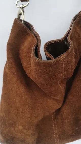 Borsaa spalla in morbido camoscio, con tasca interna con cerniera e due scomparti - Materiale: camoscio - Colore: marrone - Dettagli in metallo argentato