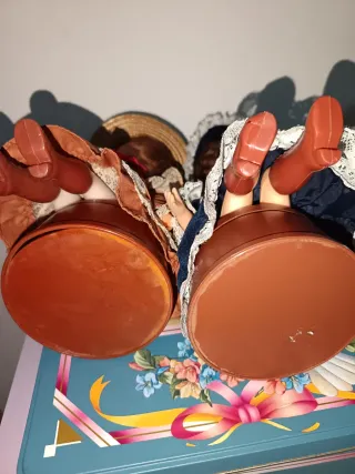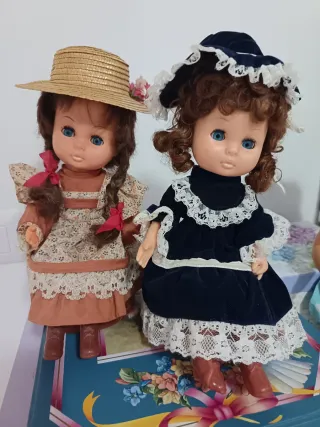 Due bambole vintage con abiti dettagliati e cappelli. Perfette per collezionisti. Carillon funzionanti - Una bambola indossa un cappello di paglia e un vestito con grembiule. - L'altra bambola ha un cappello blu e un vestito di velluto scuro. - Entrambe hanno dettagli in pizzo e stivali.