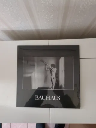 Vinile LP In The Flat Field dei Bauhaus. - Copertina nera con immagine in bianco e nero. - Testo BAUHAUS in bianco in basso.