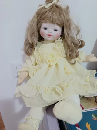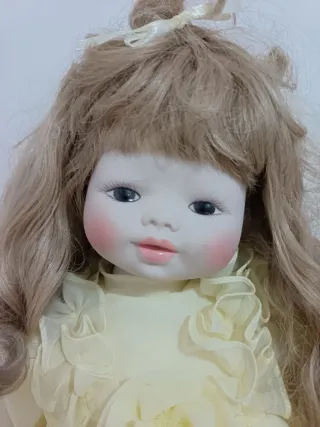 Bambola Zanini Zambelli in stile vintage con un grazioso vestito giallo decorato con ruches e un fiore, testa in porcellana con arti e corpo morbidi - Capelli biondi lunghi e ondulati. - Guance rosse e labbra rosa. - Vestito con dettagli floreali e volant. - Calzini a fantasia.