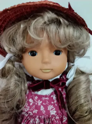 Le bambole Sekiguchi furono prodotte in Giappone all'inizio degli anni '80 come bambole da collezione per bambine più grandi, al prezzo di 80 dollari nel 1982 - Cappello in paglia color bordeaux. - Vestito con stampa floreale bianca su sfondo bordeaux. - Dettagli in pizzo bianco sul colletto e sui polsini. - Fiocco in velluto bordeaux al collo.