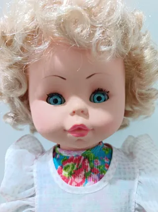 Bambola vintage rara marchio Migliorati con capelli biondi ricci e occhi azzurri., meccanismo da rivedere - Indossa un vestito a maniche lunghe con fantasia floreale. - Sopra il vestito porta un grembiule bianco con volant. - Scarpe nere.