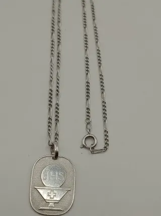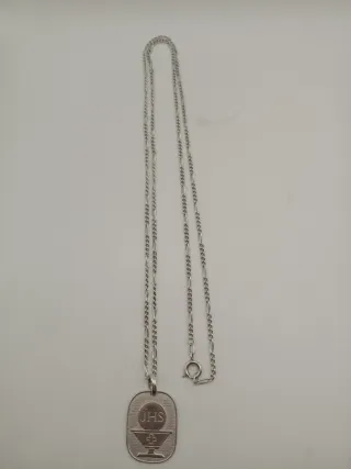 Bellissima collana con catenina a maglia figaro e medaglietta ovale in argento 925 per la Prima Comunione, con simboli eucaristici in rilievo. JHS (o IHS): Questa sigla è un cristogramma, un'antica abbreviazione del nome di Gesù risalente al III secolo. Viene anche comunemente interpretata come acronimo di diverse frasi latine. Il calice sormontato dall'ostia (il disco con la scritta JHS) sono i simboli centrali dell'Eucaristia e della Prima Comunione. Rappresentano il Corpo e il Sangue di Cristo, Ideale come idea regalo per quest'ultima. Misura catenina 72 cm ciondolo 3 x 2 cm