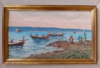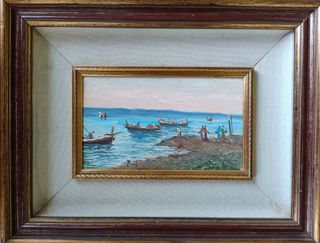 Bel cipinto ad olio firmato, con cornice, raffigurante una scena di "Ritorno dalla pesca". Misura: cm 45 x 36. La cornice è da considerarsi gentilmente offerta - Tecnica: Olio su tavola - Soggetto: Paesaggio marino con barche e figure. - Firma visibile in basso a destra.