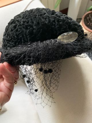 Cappellino da donna dal design elegante, perfetto per completare un outfit raffinato. - Tessuto lavorato con texture particolare. - Dettaglio in tulle con pois. - Accessorio decorativo metallico.