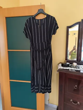 Tuta da donna con fantasia a righe verticali. Modello con cintura in vita. - Fantasia a righe bianche su fondo nero. - Cintura in vita. - Maniche corte.