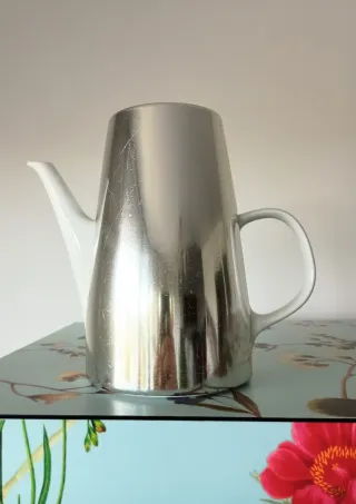 Teiera o caffettiera vintage in porcellana bianca tedesca Melitta con accessorio in lamina di metallo e interno in velluto blu che serve a mantenere caldo il tè o il caffè. Bel design senza tempo anche se l'oggetto è degli Anni '60. Porcellana in perfetto stato. Altezza: 20 cm. Diametro base: 11 cm. Sono presenti segni sulla superficie in metallo e una piccola ammaccatura.