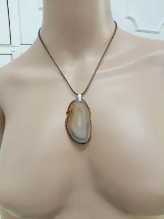 Bellissimo ciondolo in agata naturale contorni grezzi cm 6,5 con cordino intreccia fina in similpelle lungo cm 44 con catenella di allungamento fino a cm 49 - Pietra unica con sfumature di beige e marrone. - Montatura in metallo. - Cordino marrone incluso.