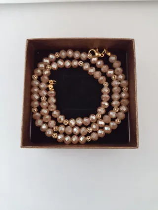 Elegante collana con cristalli austriachi sfaccettati, piccole sfere sfaccettate placcate oro 14 KT. Lunga cm 48 - Cristalli sfaccettati color beige. - Dettagli dorati. - Chiusura a moschettone dorata.