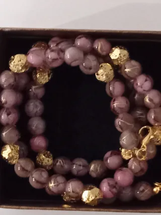 Elegante collana realizzata con perle di vetro rosa con sfumature e pietra lavica placcata.Lunga cm 55 - Perle in vetro rosa con venature. - Elementi decorativi dorati. - Chiusura a moschettone dorata.