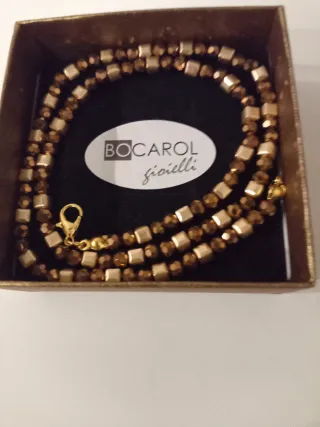 Elegante collana Bocarol realizzata con cristalli austriaci blu bronzo e perline in ottone placcate oro 14 kt.Cm 43 - Cristalli blu scintillanti. - Dettagli in oro. - Chiusura a moschettone dorata.