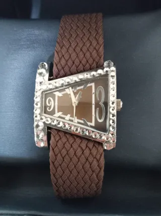 Elegante orologio Krizia vintage 2005/2006 modello raro con cinturino in tessuto marrone intrecciato. La cassa rettangolare è impreziosita da cristalli luminosi e presenta un quadrante con numeri romani. - Cinturino in tessuto marrone - Dettagli in cristallo - Design rettangolare