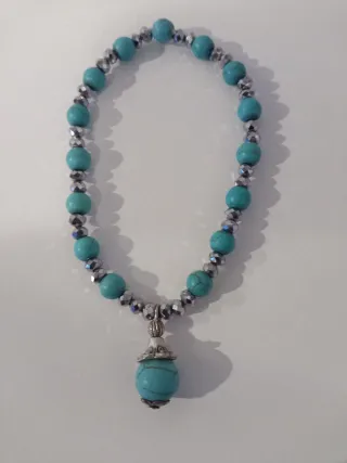 Elegante bracciale elastico realizzato con perle di howlite turchese e perline in vetro argentato con charms - Perle di howlite turchese. - Elementi decorativi color argento. - Ciondolo pendente con perla Howlite turchese