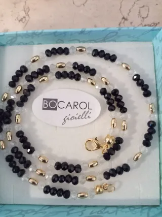 Elegante collana Bocarol con spinello nero cristallo austriaco trasparente e perle in ottone placcato oro 18 kt .Cm 57 - Perle sfaccettate nere. - Cristalli trasparenti. - Elementi ovali color oro. - Chiusura a moschettone dorata.