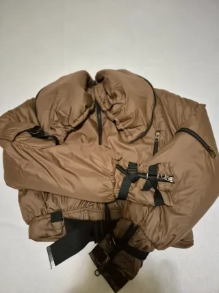 Elegante giubbino corto da donna. Tutto in Viscosa e Poliestere. Molto caldo. Con cappuccio apribile a formare un collo. - Design corto e moderno - Dettagli con zip e cinturino - Tessuto imbottito