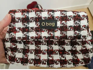 Elegante pochette Obag con una fantasia a quadri nei toni del rosso e del bianco. Il logo Obag è applicato su una patch nera. - Fantasia a quadri. - Patch nera con logo.
