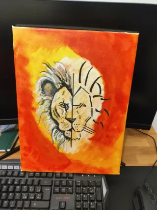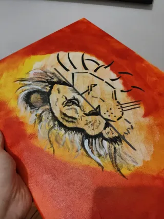 Dipinto acrilico su tela raffigurante un leone. - Tecnica mista con dettagli realistici e stilizzati. - Colori vivaci su sfondo arancione e giallo. - Dimensioni: 40x30 cm.