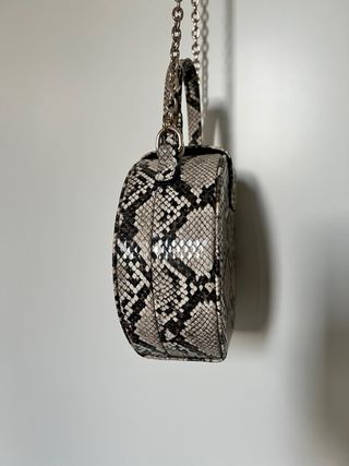 Elegante borsetta rotonda rigida, perfetta per completare il tuo look. - Tracolla a catena metallica. - Chiusura a scatto. - Design a fantasia pitonata.