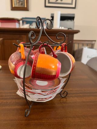 Elegante set di sei tazzine da caffè con i relativi piattini, perfette per gustare un espresso. - Design colorato e vivace. - Supporto in metallo per riporle comodamente. - Ideali per un regalo o per arricchire la tua cucina.