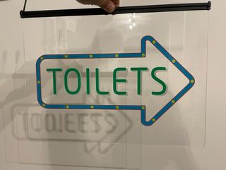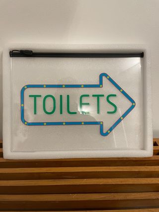 Segnale luminoso a forma di freccia per indicare la direzione dei servizi igienici. - Design moderno con illuminazione a LED. - Cornice esterna blu con dettagli gialli. - Testo TOILETS in verde. Insegna 40cm x 30cm NUOVA ma non sono stato capace di farla funzionare, forse guasta, da provare ad aggiustarla se no da tenere come insegna semplice. Ha la presa, cavo, telecomando e catena per appenderla. Nuova costa 91€.