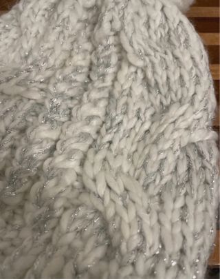 Morbido berretto in maglia con un soffice pon pon in cima. Il filato presenta sottili fili argentati che aggiungono un tocco di brillantezza. - Design a trecce. - Pon pon bianco in cima.