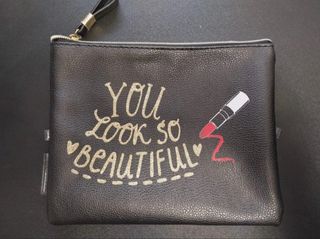 Pochette nera con scritta You Look So Beautiful e disegno di un rossetto. - Chiusura con zip. - Dettaglio con nappina e anello dorato. - Materiale effetto pelle. Piccola pochettina della comomilla colore nero. Dimensioni: L 20cm x H 16