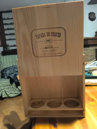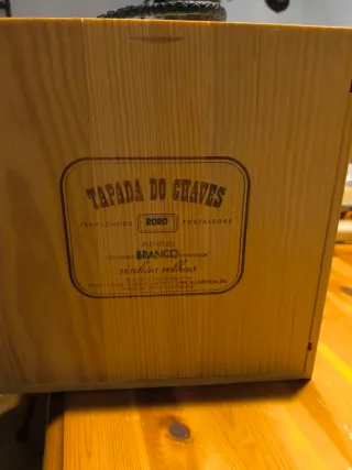 Elegante cassetta in legno per conservare bottiglie di vino. - Materiale: Legno di pino - Dettagli: Logo TAPADA DO CHAVES impresso - Anno: 2020 - Tipologia vino: Alentejo Branco - Caratteristiche: Vinhas Velhas