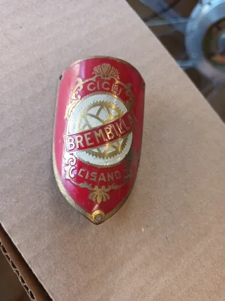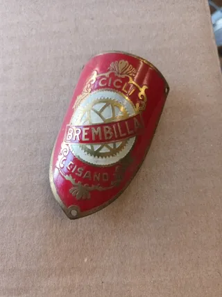 Stemma in ottone originale per biciclette d'epoca. - Design a scudo rosso con dettagli dorati. - Scritta Cicli Brembilla - Dettagli a forma di ruota dentata e conchiglia.