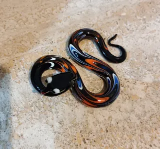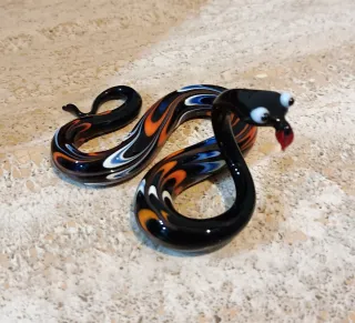 Delizioso Serpente in vetro di Murano, con un design unico e colorato. - Realizzato in vetro soffiato. - Decorazioni screziate in nero, arancione e blu. - Dettagli degli occhi bianchi e lingua rossa. In perfetto stato!