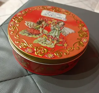 Deliziosa scatola rotonda in latta, perfetta per conservare piccoli oggetti o come elemento decorativo. La sua superficie è impreziosita da un'illustrazione colorata di fatine immerse tra fiori e foglie. - Design con fatine e decorazioni floreali. - Materiale: latta. - Forma: rotonda. Diametro 15 cm circa