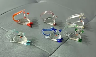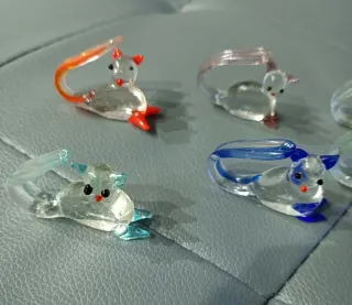 Delizioso set di sei piccoli gattini realizzati in vetro di Murano. Ogni gattino presenta dettagli colorati e una forma unica. - Materiale: Vetro di Murano. - Quantità: 6 pezzi. - Design: Gattini stilizzati con dettagli colorati. In perfetto stato!