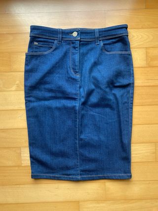 Gonna in jeans color blu scuro elasticizzato e morbido Armani Jeans. Con due tasche davanti e due tasche e spacco dietro. Taglia 40 italiana (vita 36 cm lunghezza 57 cm). Perfetta vestibilità,adatta per chi vuole essere alla moda e anche comoda.