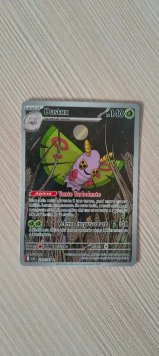 Carta Pokémon Dustox Ascesa Eroica. - Abilità: Vento Turbolento - Attacco: Veleno Crepuscolare - Valore attacco: 100 - Numero carta: 220/217