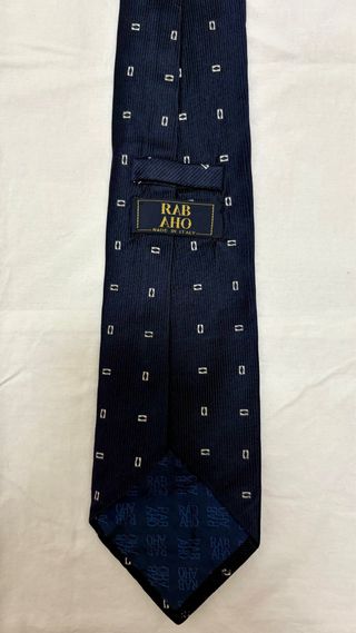 Cravatta da uomo RAB AHO, Made in Italy, colore blu scuro con elegante fantasia geometrica. Stile classico e raffinato, ideale per ufficio, cerimonie o abiti sartoriali.