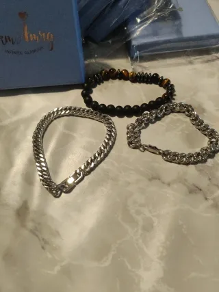 Lotto composto da 3 bracciali - Braccialetto con pietre nere e occhio di tigre. - Braccialetto in maglia d'acciaio. - Braccialetto in maglia d'acciaio con chiusura.