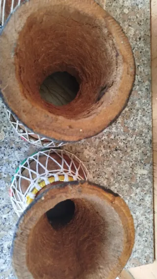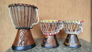 Set di tre bonghi africani realizzati a mano. - Materiale: legno e pelle. - Decorazioni artigianali sul corpo dei tamburi. - Corde di tensione in pelle e tessuto colorato.