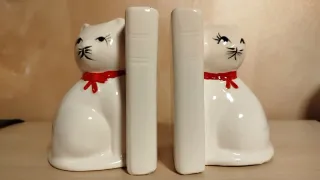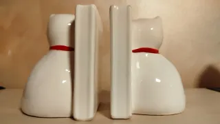 Deliziosa coppia di fermalibri in ceramica a forma di gatti bianchi con un vivace fiocco rosso al collo. Perfetti per aggiungere un tocco di stile e personalità alla tua libreria. - Materiale: Ceramica - Colore: Bianco con fiocco rosso - Design: Gatti stilizzati