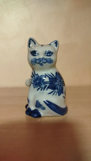 Deliziosa statuina di gatto in ceramica, dipinta a mano con motivi floreali blu. - Altezza: 12 cm - Design con fiori blu su sfondo bianco
