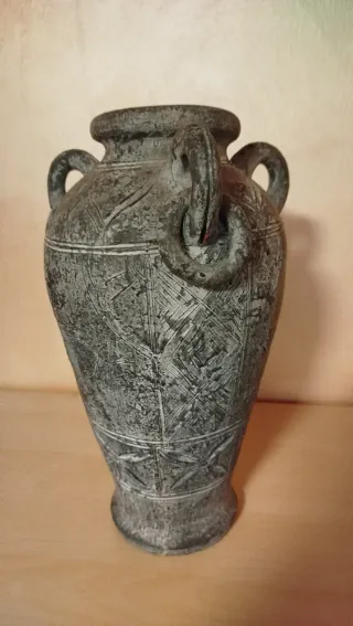 Elegante vaso decorativo a forma di anfora, alto 36 cm. Presenta un design anticato con incisioni che richiamano motivi floreali e figure stilizzate. - Altezza: 36 cm - Materiale: pietra - Finitura: Effetto anticato con incisioni decorative