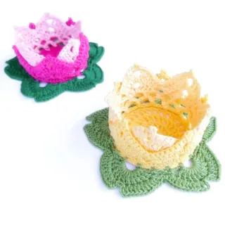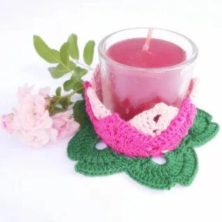 Delizioso porta candele realizzato all'uncinetto, a forma di fiore di loto. Perfetto per aggiungere un tocco di colore e originalità alla tua casa e alle tue feste. - Realizzato a mano con cura. - Design a forma di fiore di loto. - Colori vivaci e allegri, nella variante gialla e rosa.