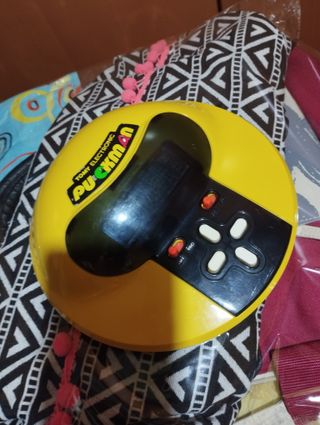 Gioco elettronico portatile Pac-Man della Tomy. - Design rotondo e giallo. - Pulsanti di gioco neri e bianchi. - Grafica Pac-Man sul corpo del gioco.