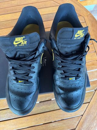 Scarpe Nike Air Force 1 '07. - Tomaia in pelle nera. - Dettagli color oro. - Logo Nike Air sulla linguetta e sul tallone.