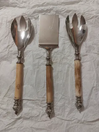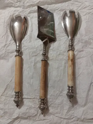 Elegante set di posate composto da due forchettoni e una paletta. - Manici in legno. - Dettagli in metallo argentato.