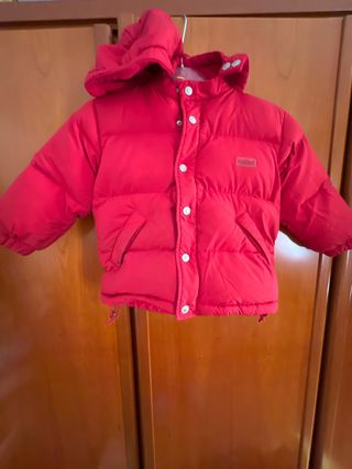 Caldo giubbotto imbottito per bambino, perfetto per le giornate più fredde. - Colore rosso vivace. - Cappuccio integrato. - Chiusura con bottoni. - Tasche laterali. - Patch logo sul petto. Presenta segni d’usura come foto