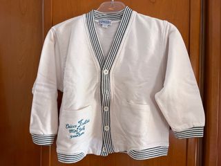 Cardigan Chicco per bambino, colore bianco con bordi a righe bianche e verde. Presenta una chiusura con bottoni e due tasche frontali. 100% cotone garzato - Logo Chicco First Club Mini Golf ricamato. - Polsini e fondo a costine.