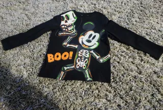 Maglietta a maniche lunghe nera con stampa a tema Halloween di Topolino scheletro....si illumina di notte! - Stampa BOO! arancione. - Dettagli fluo su Topolino e teschio - Maniche lunghe.